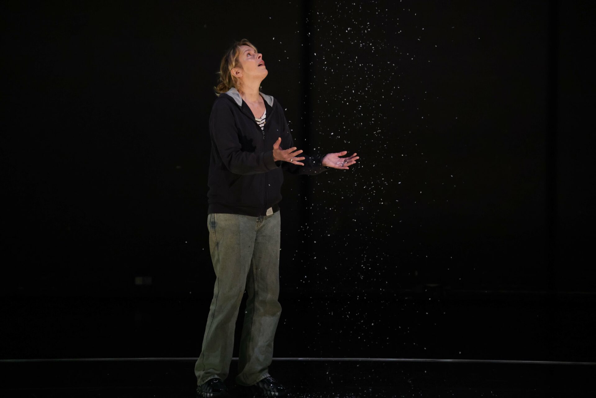 Trois comédiennes marionnettistes manipulent à vue et avec précision, sur une partition musicale qui mêle chant traditionnel et son électro, et dans une scénographie mobile (effets lumière, ombres, papier et tissu aérien) de toute beauté.